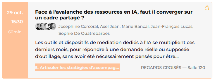 Les outils et dispositifs de médiation dédiés à l’IA se multiplient ces derniers mois, pour répondre à une demande réelle ou supposée d'outillage, sans avoir été nécessairement pensés pour être complémentaires et durables. Dans ce cadre, la question des standards de production des ressources pédagogiques en matière de numérique et plus largement l'approche par référentiel de compétences nécessitent d'être interrogées, sans oublier d'évoquer les finalités de cette éducation à l'IA.